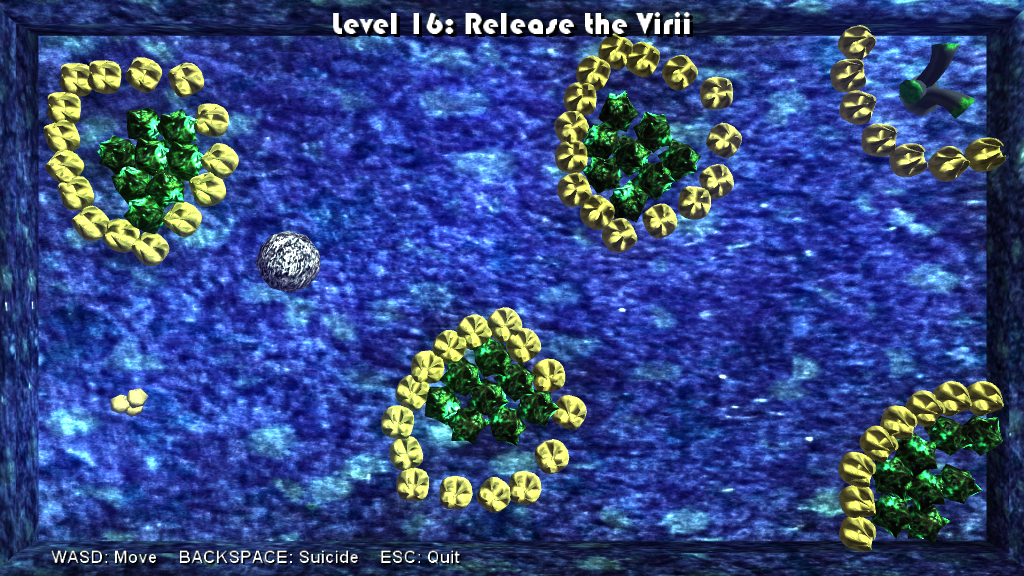 A strange cellular Action / Puzzle game - made in 47.9 hours :). Get your white blood cell to the tentacle-looking receptor to advance through the levels (40 total). Fight a big tumor at the end.